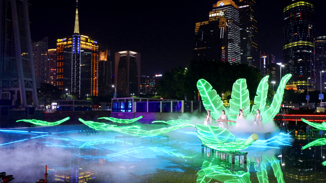 在廣州國際燈光節(jié)的璀璨夜里,巨大的熒光綠葉如翡翠般舒展,在水霧氤氳中似有靈韻,仿若從嶺南園林的幽深處飄然而至。幾位身著素雅古風(fēng)服飾的演奏者端坐 “葉舟” 之上,絲竹之音似與光影共振,將嶺南文化的溫婉雅致融入現(xiàn)代光影技術(shù)的震撼里。