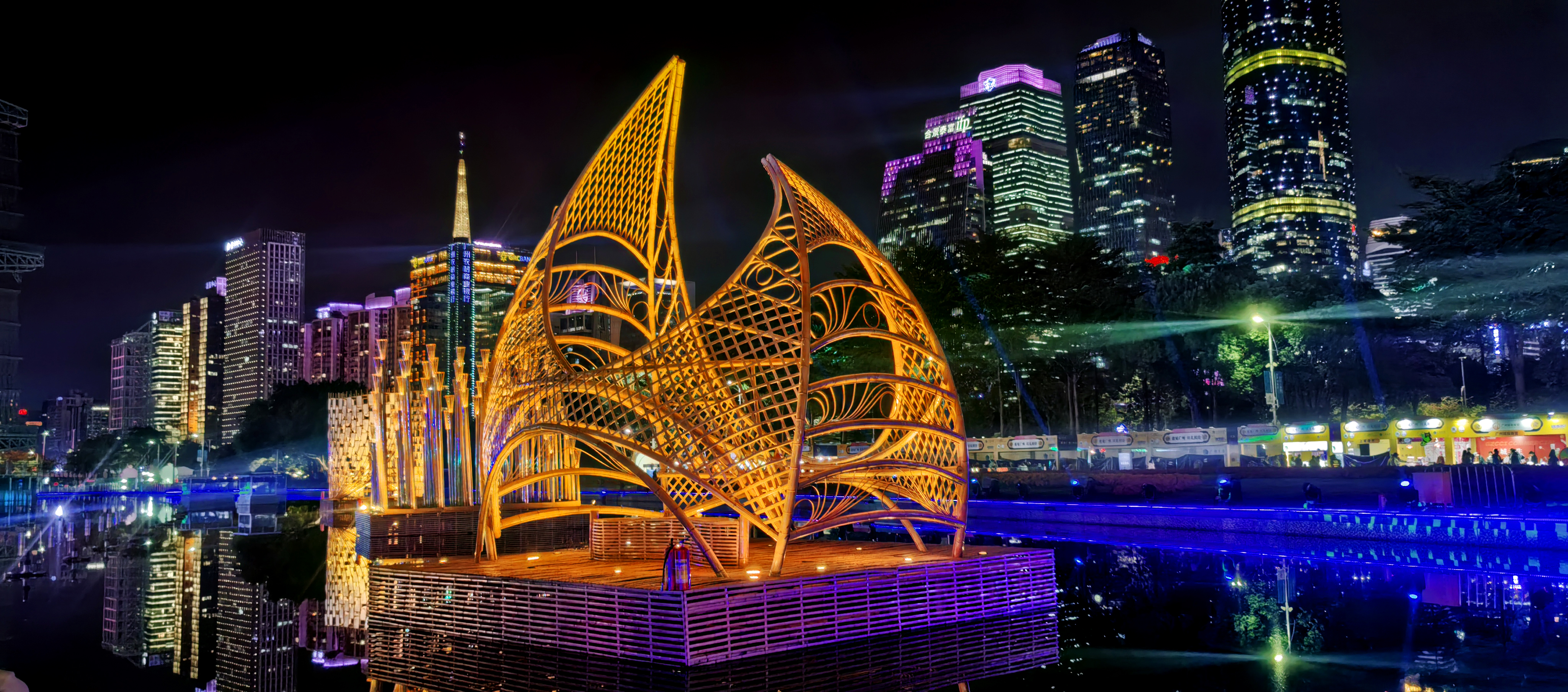 以 “鼓” 為核心元素,既展現(xiàn)了嶺南傳統(tǒng)鼓樂文化的厚重,又通過現(xiàn)代燈光技術(shù)賦予其科技感與藝術(shù)感,在 “智匯灣區(qū)?悅動全運” 的主題下,演繹出力與美的和諧共鳴,傳遞出全運精神與灣區(qū)人文的交融。嶺南傳統(tǒng)竹藝跟傳統(tǒng)亭臺,與現(xiàn)代燈光技術(shù),金色的編織結(jié)構(gòu)在夜色中熠熠生輝,既展現(xiàn)了古代海上絲綢之路的商貿(mào)文化,又象征著廣州作為灣區(qū)核心城市在新時代的開放與奮進(jìn)。